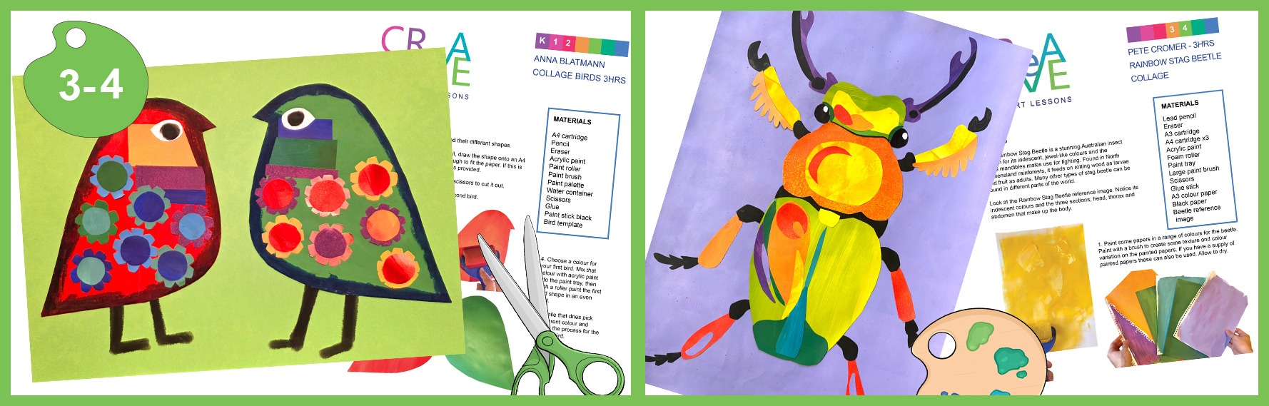 Pete Cromer is a much loved Australian Artist who creates animals from painted paper collage. The Stag Beetle is found in many differeent countries around the world but none is as spectacular as the Australian Rainbow Stag Beetle. Its beautiful iridescent shell, (or exoskeleton) is an array or wonderful colours. We create painted papers and learn about highlights and shadow as the composition develpps. Tie this lesson plan in with science to explore insects and the 3 body parts, head, thorax and abdomen.