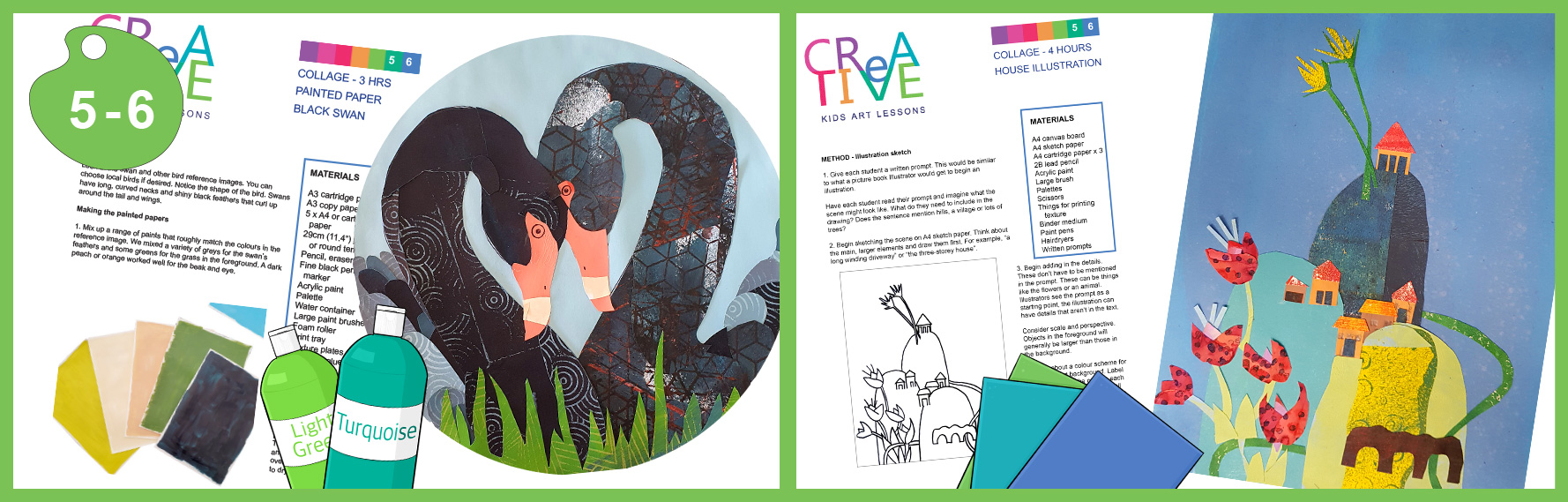 The black swan is an iconic Australian bird. The lesson plan includes several birds to choose from and could easily be adapted to a bird that is local to where you are located. You could also change the lesson plan to create a dark background and white swans if preferred. The lesson focuses on colour and texture. Kids create a range of painted papers and then add texture with various found objects or print plates to match the bird they have chosen.