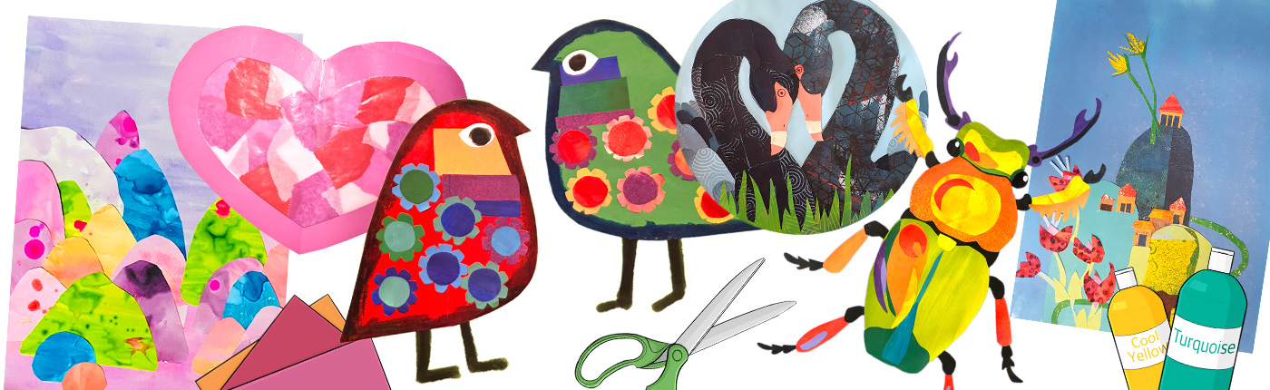 We love creating collage projects with our students! Collage allows for exploration and experimentation with texture and colour to create collage materials, then kids interpret the project ideas in their own way, resulting in a wonderful variety of unique artworks.