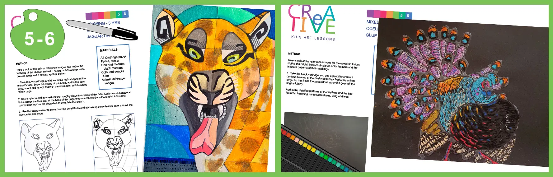 Use chalk pastels to draw an occelated turkey on black paper. Make the colours pop in this amazing bird whose iridescent feathers are something to behold. Use glue to create an outline and then add colour in small lines with chalk pastels to complete the artwork. These projects will assist in skill-building with imaginative exploration, allowing your students to create unique, finished artworks they’ll be excited to share.