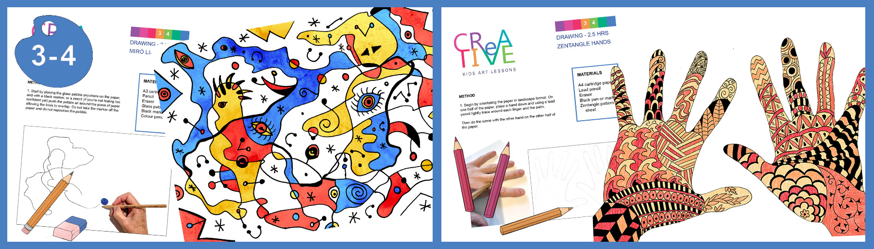 Draw detailed, Zentangle-style, patterned hands. Add colour using pencil with a limited colour palette to create contrast, variation and a cohesive design.
