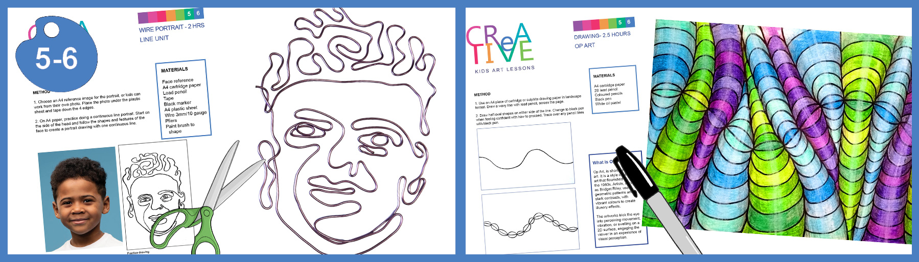 In the 5-6 grade category, students will learn about the works of two artists, Alexander Calder and Bridget Riley. These art projects will develop a wire students’ understanding of line through sculpture and optical art.