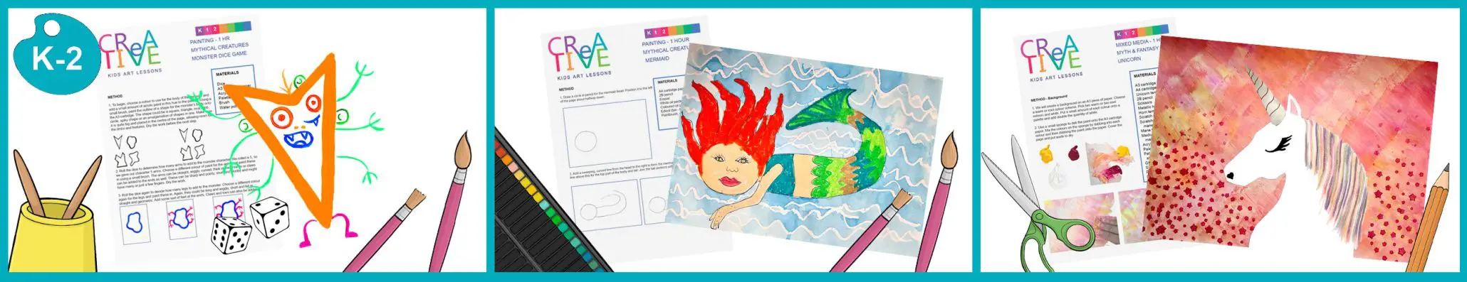 Mythical creatures for Kindergarten, grade 1 and grade 2. In these lesson plans students will have fun painting friendly monsters in a dice throwing, painting game. We look at a sweet underwater mermaid and create a gorgeous unicorn artwork with a rainbow wool mane.Â