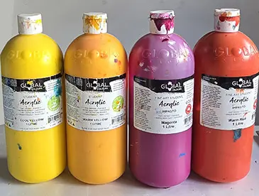 Paint: Student-grade acrylic or liquid tempera paints are ideal. We use Global acrylics in the 1 litre containers and because they are not too heavy, kids aged 7 and up can get their own paint. The nozzle is small, restricting how much paint can be squeezed out quickly and most importantly, doesn’t clog up.